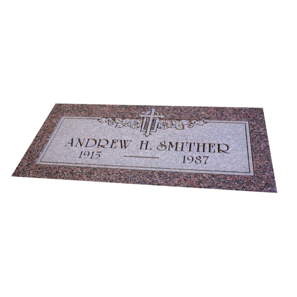 Crafted from warm Colonial Rose granite, this flat memorial marker features a beautifully polished finish and a refined balance of elegance and tradition. The panel is framed by a decorative border and accented with a carved cross and floral motif — offering a quiet nod to faith and beauty.