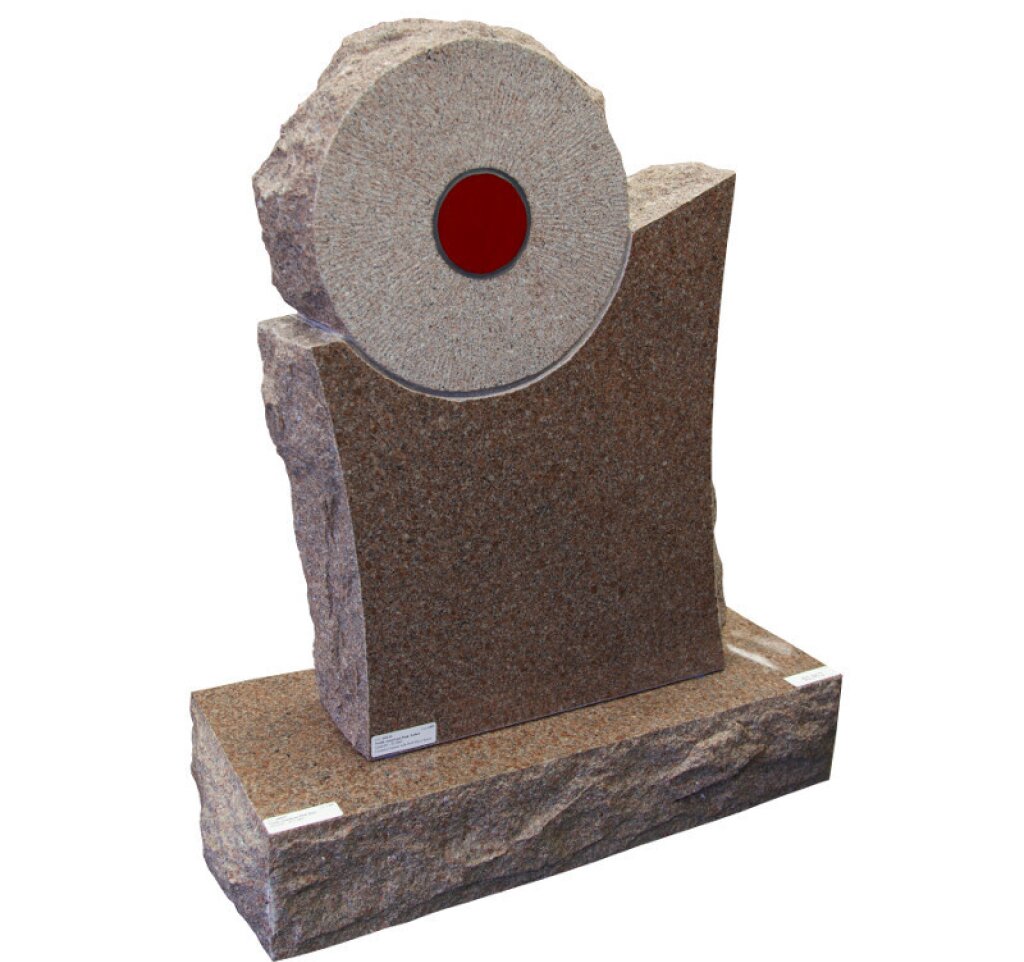 Artfully sculpted from warm rose granite, this modern memorial design is a true statement piece. The sweeping, asymmetric form rises into a textured circular element that features a striking inlay of deep red polished glass — a bold centerpiece symbolizing love, vitality, and remembrance.